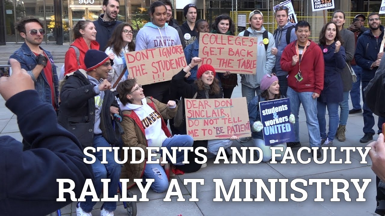 Striking college faculty rallied on Oct. 25, 2017 in front of the Ministry of Advanced Education and Skills Development to call on minister Deb Matthews to pressure the colleges back to the table.