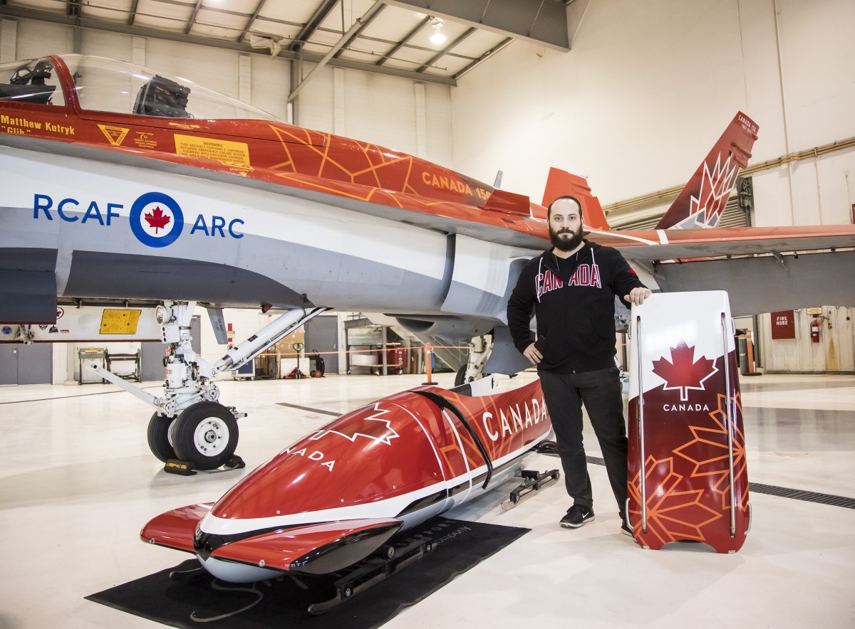 The relationship BCS has with the Royal Canadian Air Force (RCAF) came into play as bobsleigh and skeleton athletes had completed some training exercises with RCAF members to prepare mentally for the games. The design of the sleds is based on the Canada 150 CF-18 jet, whose look was created by Jim Belliveau, a former 410 Squadron graphic designer. As for Dornan, he had been at a TFC soccer game and was amazed at seeing the CF-18 roar over BMO Field and it formed the theme for his work.