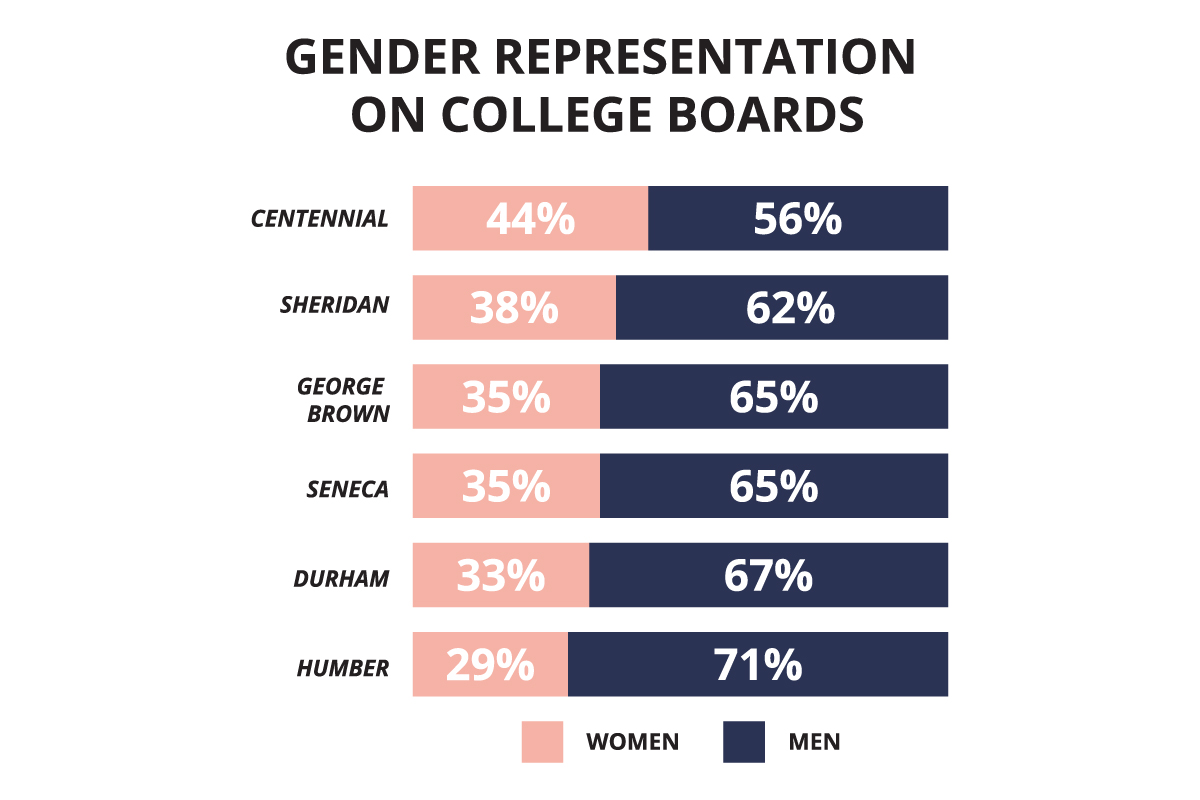 In terms of gender balance, the boards have almost twice as many men as women. The average representation of men on college boards is just over 64 per cent at Toronto-area colleges, which includes George Brown, Centennial, Durham, Humber, Seneca, and Sheridan, while women hover around 36 per cent.