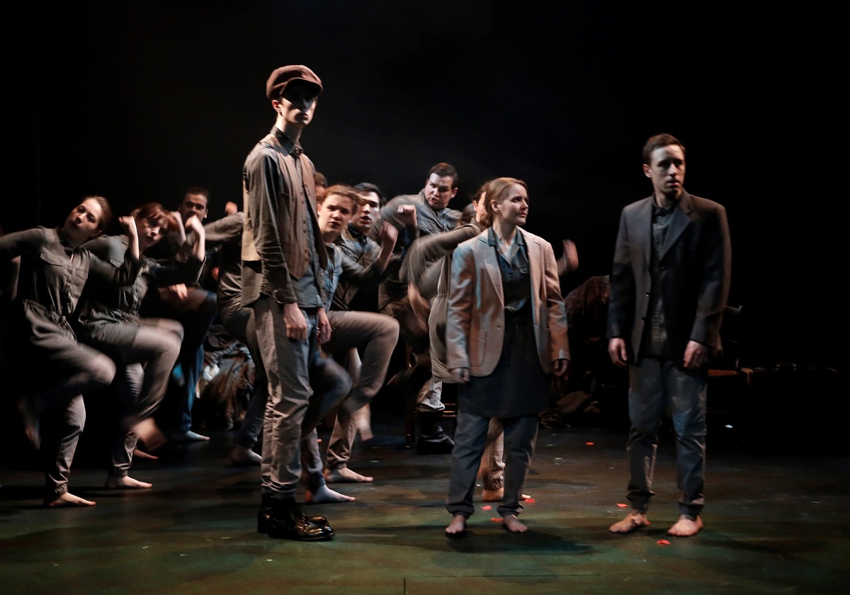 At the start of the play, the ensemble cast walk out onto the stage and remove their shoes, performing mostly in bare feet. Along with a couple of piles of discarded clothing, the simple set foreshadows the Holocaust that hadn’t happened when the play was first produced in 1938.