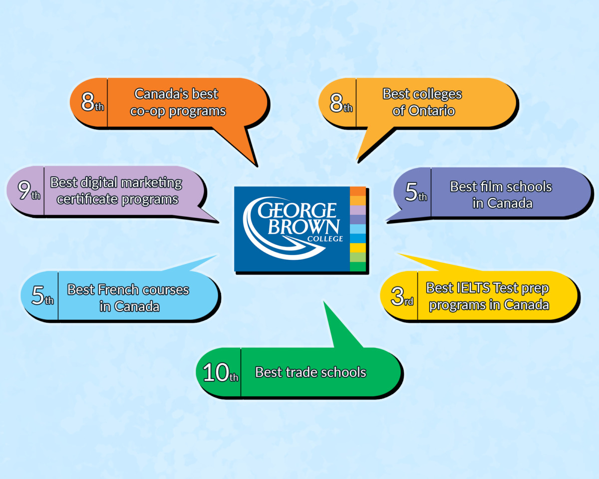 The college ranked number eight in the categories of best college of Ontario and Canada’s best co-op programs, ranked number five in categories of best film schools in Canada and best French courses in Canada, ranked number three in best IELTS test prep programs in Canada, ranked number nine in best digital marketing certificate programs, and ranked number 10 in best trade schools