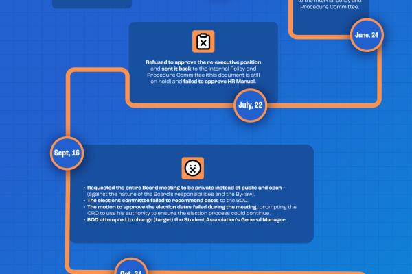 The board of directors are supposed to answer to you, the students. You are their boss. With all of the underhanded things they have tried so far, there’s no question that this group has more planned to try and benefit only themselves. With the Annual General Meeting tomorrow and elections starting next week, it’s time…