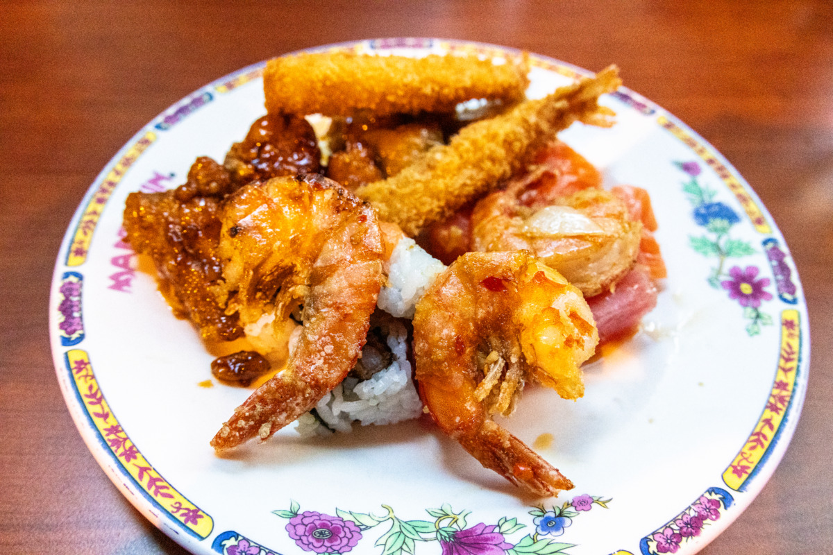 The food sections include raw fish and sushi, grilled foods, an enormous variety of chicken and meat specials, noodles, rice, soups, and shrimp prepared in different ways (grilled, boiled, and raw). The buffet is also vegetarian-friendly, with vegan and gluten-free options available.