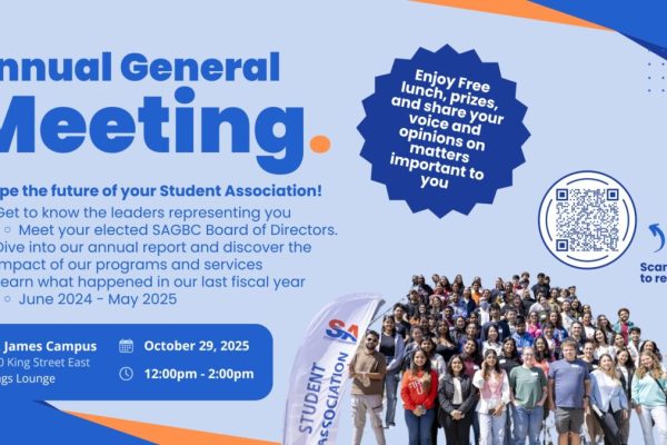 The 2025 Annual General Meeting (AGM) is on the way. The Student Association of George Brown College (SAGBC) AGM is taking place Oct. 29, from 12 Noon to 2 p.m., in the King’s Lounge of the St. James campus At the AGM, student members are encouraged to come out, not only to learn more about…